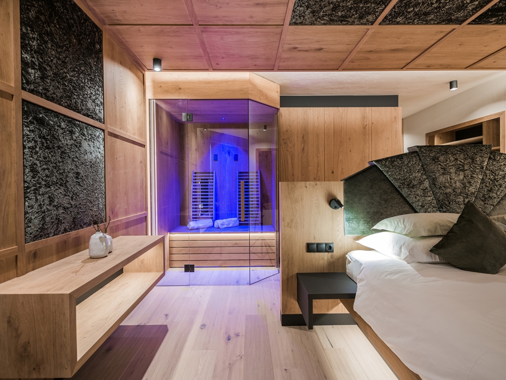 60 m², balcone con vista sulle montagne, pavimento in legno, accogliente angolo salotto, camera per bambini separata con letti singoli, bagno con vasca e doccia, WC separato con bidet, asciugacapelli, cassaforte, minibar, macchina Nespresso, telefono, scrivania, TV satellitare, accesso WiFi gratuito, aria condizionata, borsa wellness con accappatoi e asciugamani