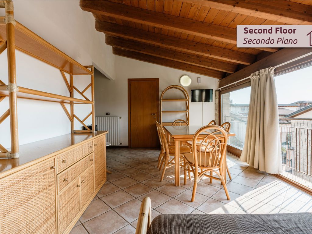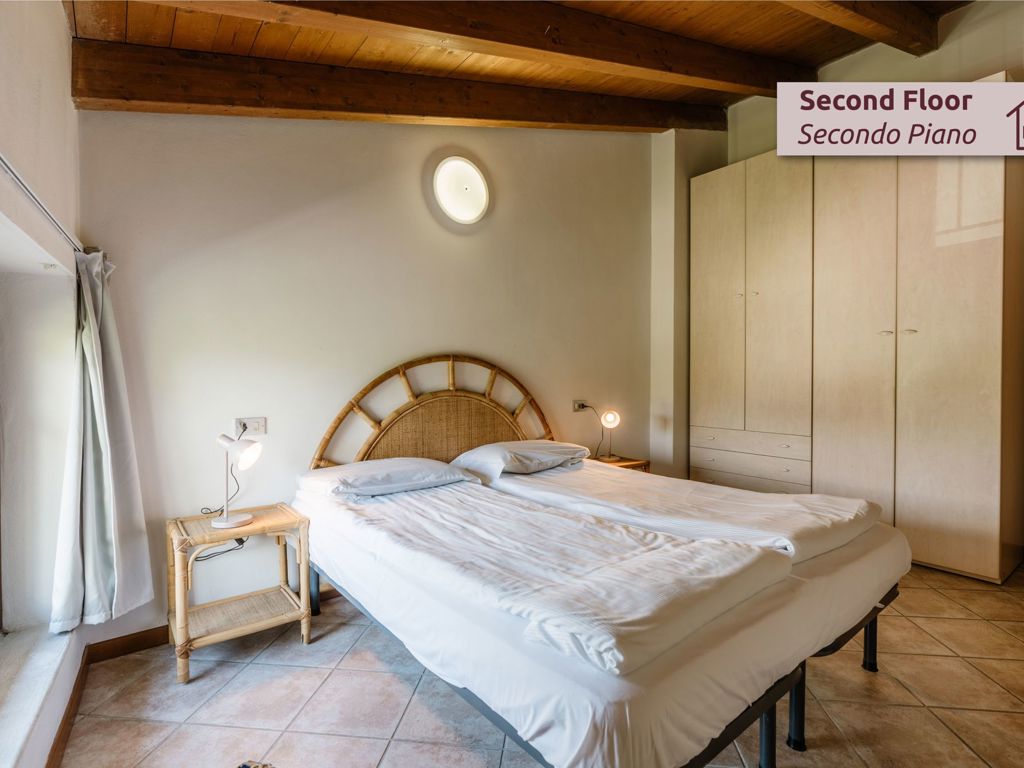 Quadrilocale di 80-100 mq al secondo piano, caratterizzato da grandi vetrate panoramiche con vista sulle colline moreniche. Soffitti alti con travi in legno a vista, ambienti luminosissimi e ariosi. Soggiorno spazioso con angolo cottura completamente attrezzato (piano cottura quattro fuochi, frigocongelatore, lavastoviglie, forno microonde), divano letto matrimoniale, tre camere matrimoniali, due bagni di cui uno con doccia. Arredi eleganti in legno e rattan, tessuti dai toni caldi. Wi-Fi gratuito, TV-Sat, cassaforte, biancheria inclusa. Spazio riservato all'esterno: tavolo con sedie nella corte storica della cascina. Posto auto coperto in garage. Animali ammessi su richiesta. Ideale per famiglie numerose e gruppi di amici fino a 7 persone che cercano luce e panorami. Per i soggiorni oltre le 2 notti, le spese del gas per il riscaldamento vengono addebitate in base al consumo pari a € 1,50 per metro cubo.